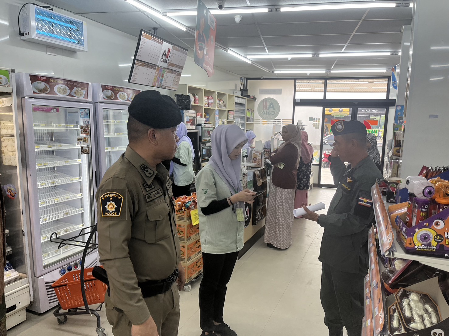 สภ.กะพ้อฯออกตรวจสอบ ประชาสัมพันธ์ ร้านสะดวกซื้อเซเว่น มินิบิ้กซีให้ตรวจสอบความผิดปกติในร้าน สังเกตบุคคลแปลกหน้า มีเหตุด่วนสามารถแจ้งเข้า สภ.ได้ทันที