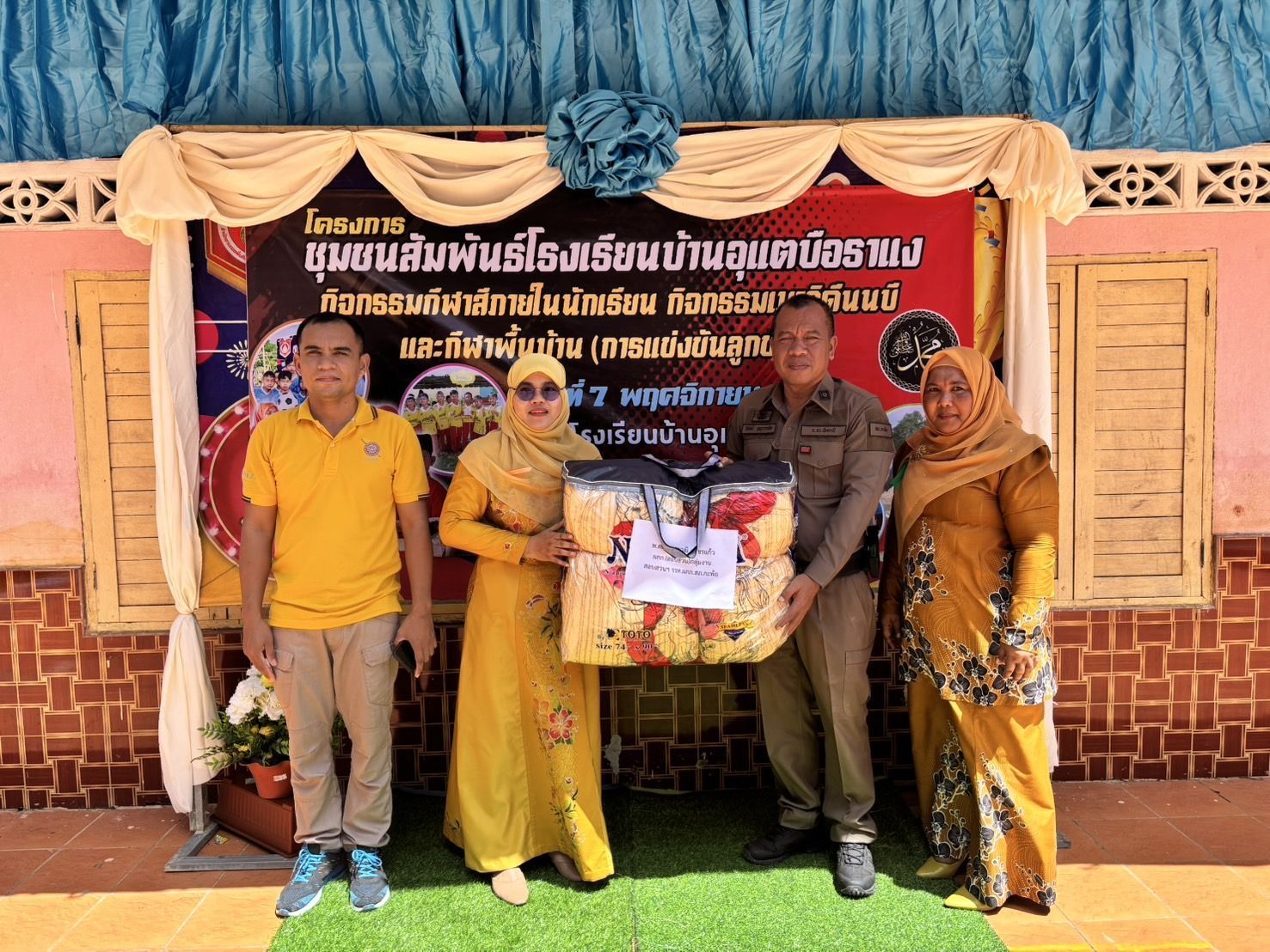 พิธีส่งมอบบ้านกาชาดจังหวัดปัตตานี พร้อมมอบ ผ้านวม 1 ผืน ให้กับเจ้าของบ้าน ตามโครงการช่วยเหลือผู้ด้อยโอกาสในสังคมเฉลิมพระเกียรติ เทิดทูนองค์ราชัน