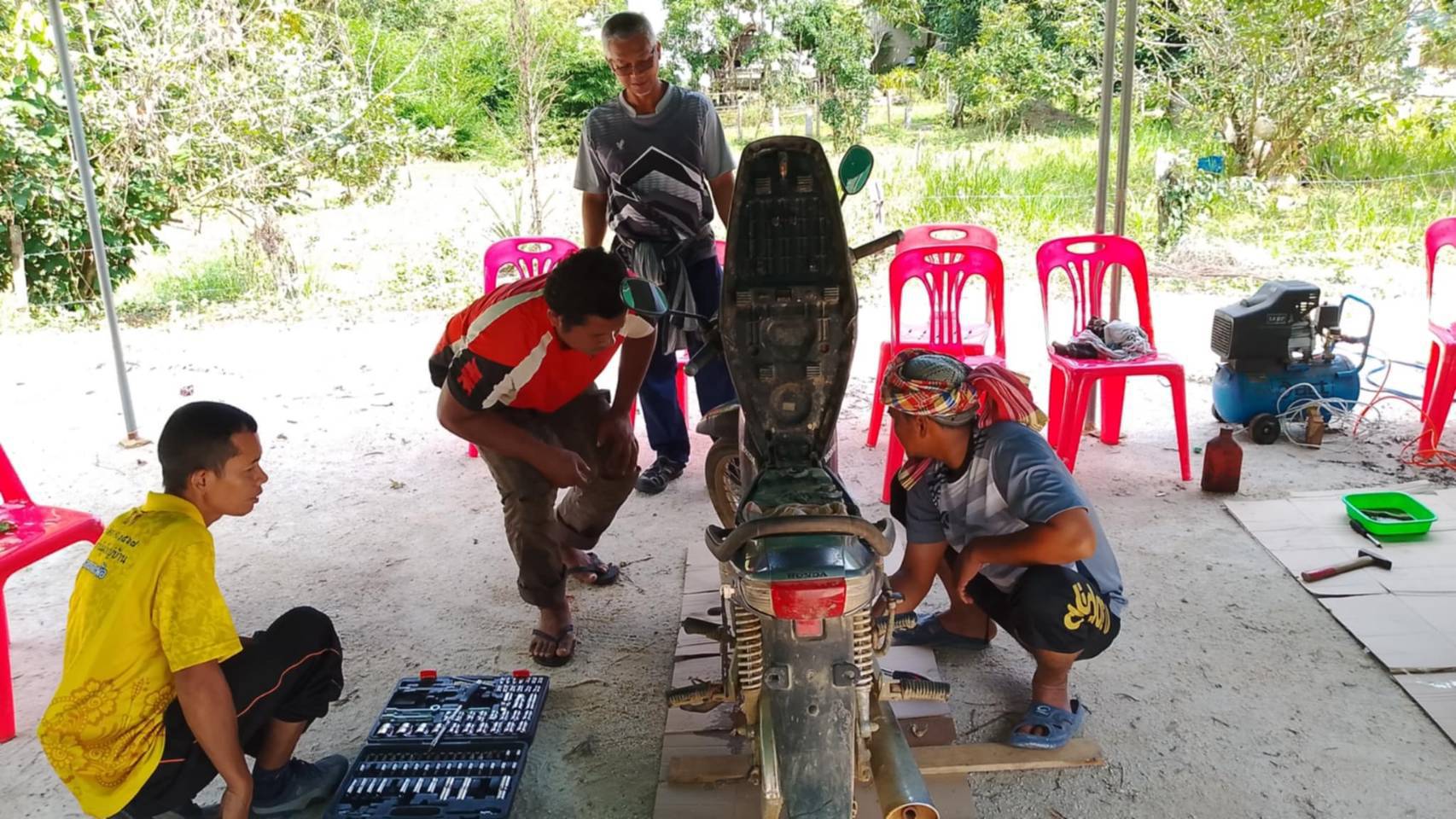 มอบเงินสนับสนุนให้กับนายมะซาวี กามะอดีตผู้ช่วยผู้ใหญ่บ้าน ม.8ต.กะรูบี ซึ่งเป็นประธานกลุ่มช่างซ่อมมอเตอร์ไซร์พร้อมด้วยช่างและชาวบ้านในพื้นที่จัดร่วมกิจกรรมซ่อมบำรุงล้างเครื่องรถจักรยานยนต์ให้บริการฟรี มี-การถ่ายน้ำมันเครื่อง ล้างเครื่อง