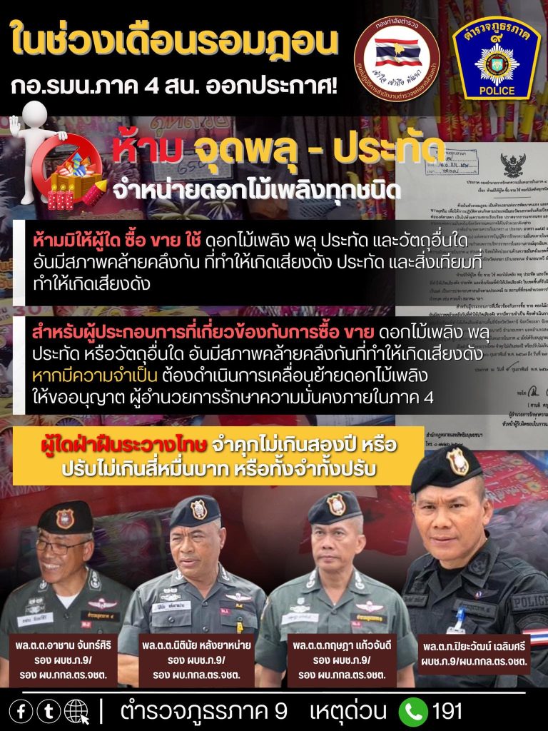 สำหรับผู้ประกอบการที่เกี่ยวข้องกับการซื้อ ขาย ดอกไม้เพลิง ประทัด และสิ่งเทียมที่ทำให้เกิดเสียงดัง หากมีความจำเป็น ต้องดำเนินการเคลื่อนย้ายดอกไม้เพลิง ประทัด และสิ่งเทียมที่ทำให้เกิดเสียงดัง ผ่านพื้นที่ในห้วงเดือนรอมฎอน ให้ขออนุญาต ผู้อำนวยการรักษาความมั่นคงภายในภาค 4 เมื่อได้รับอนุญาตแล้ว ให้สามารถทำการเคลื่อนย้ายได้