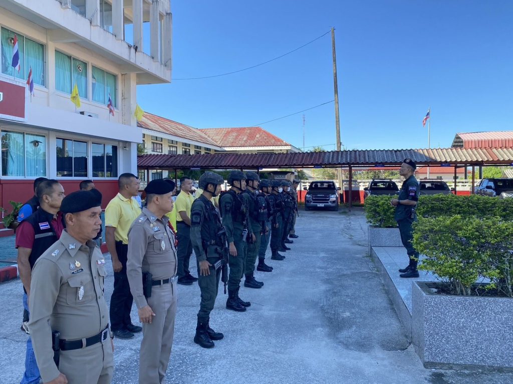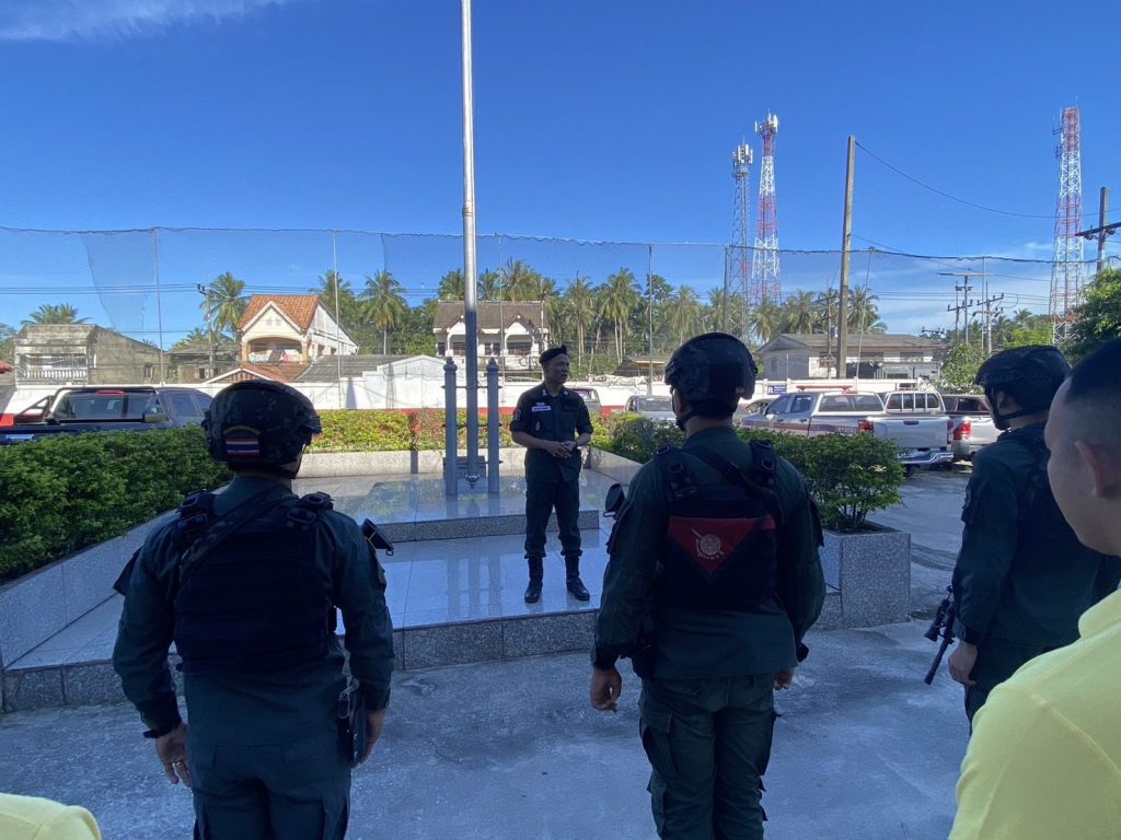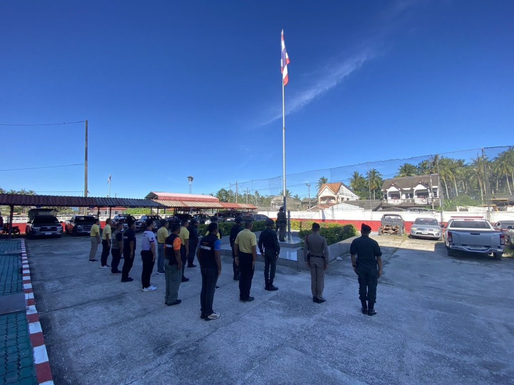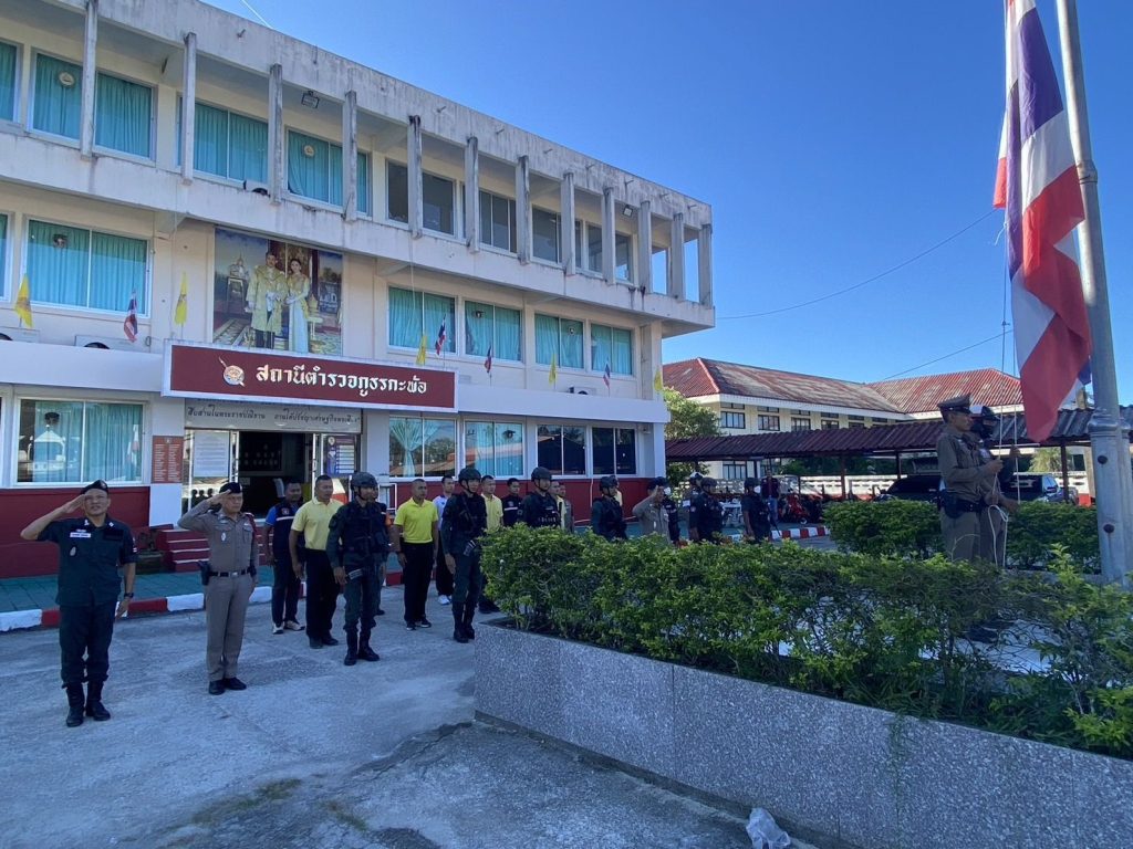 พ.ต.อ.อรรถวุฒิ เพชรแก้ว ผกก.(สอบสอน)ฯ รรท.ผกก.สภ.กะพ้อ พ.ต.ท.เสน่ห์ จันทร์หอม สว.(สอบสวน)สภ.กะพ้อ พ.ต.ต.ศิริพงษ์ หวังกุหลำ สวป.สภ.กะพ้อ พร้อมข้าราชการตำรวจปฏิบัติการจู่โจม ฝ่ายอำนวยการ ชุดจราจร ลงแถวเคารพธงชาติ แจ้งข้อราชการ และการข่าวที่สำคัญ