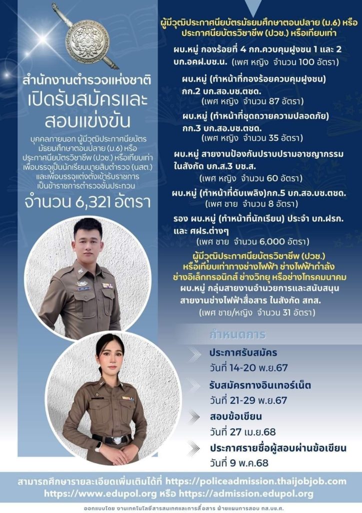 เปิดรับสมัคร นักเรียนนายสิบตำรวจ (ชาย/หญิง) ทั่วประเทศ (วุฒิ ม.ปลาย หรือเทียบเท่า) รวมกว่า 6,321 อัตรา