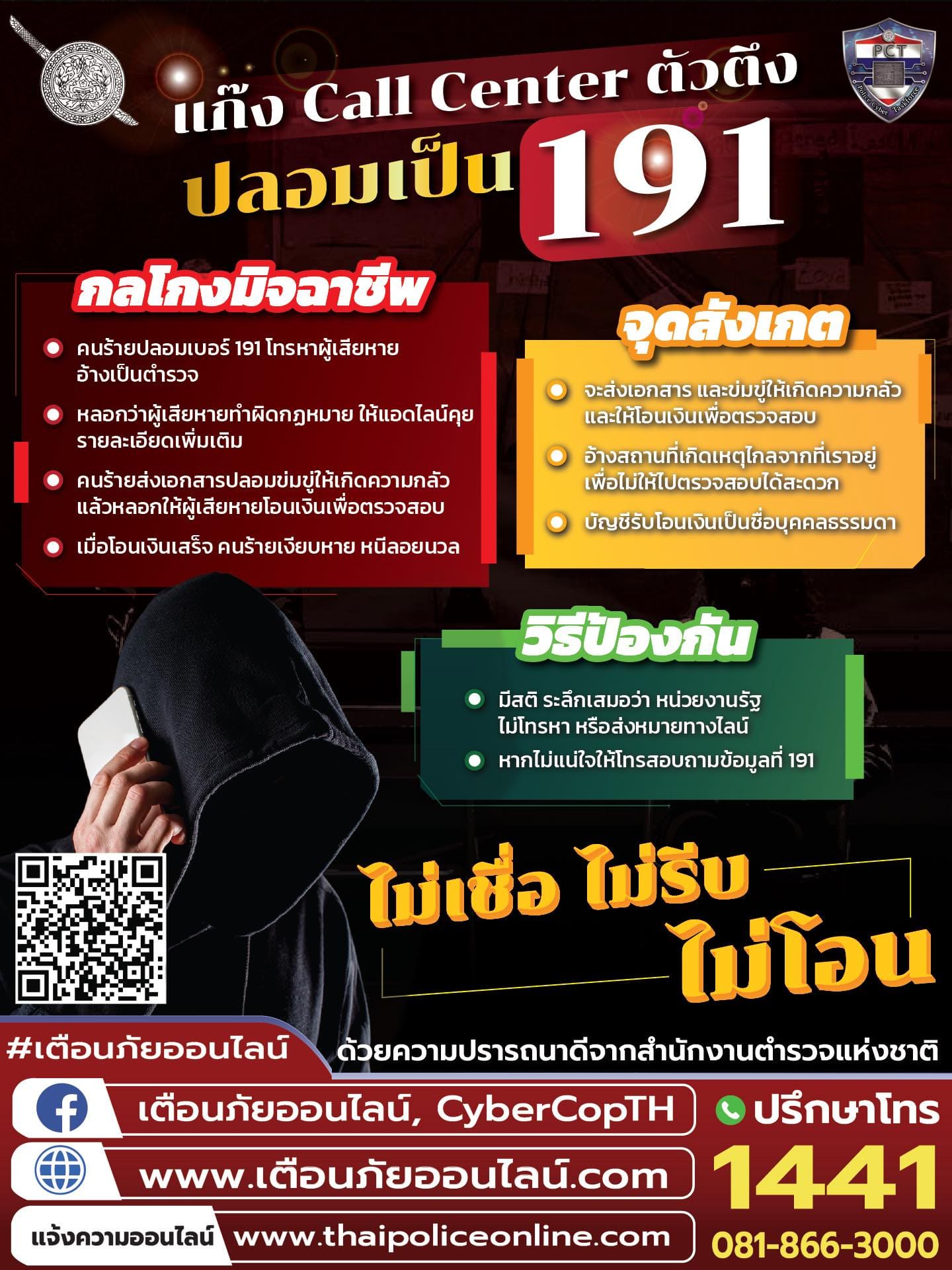 แก๊ง Call Center ตัวตึง ปลอมเป็น 191 กลโกงของคนร้าย : 1. คนร้ายปลอมเป็นเบอร์ 191 แอบอ้างเป็นเจ้าหน้า